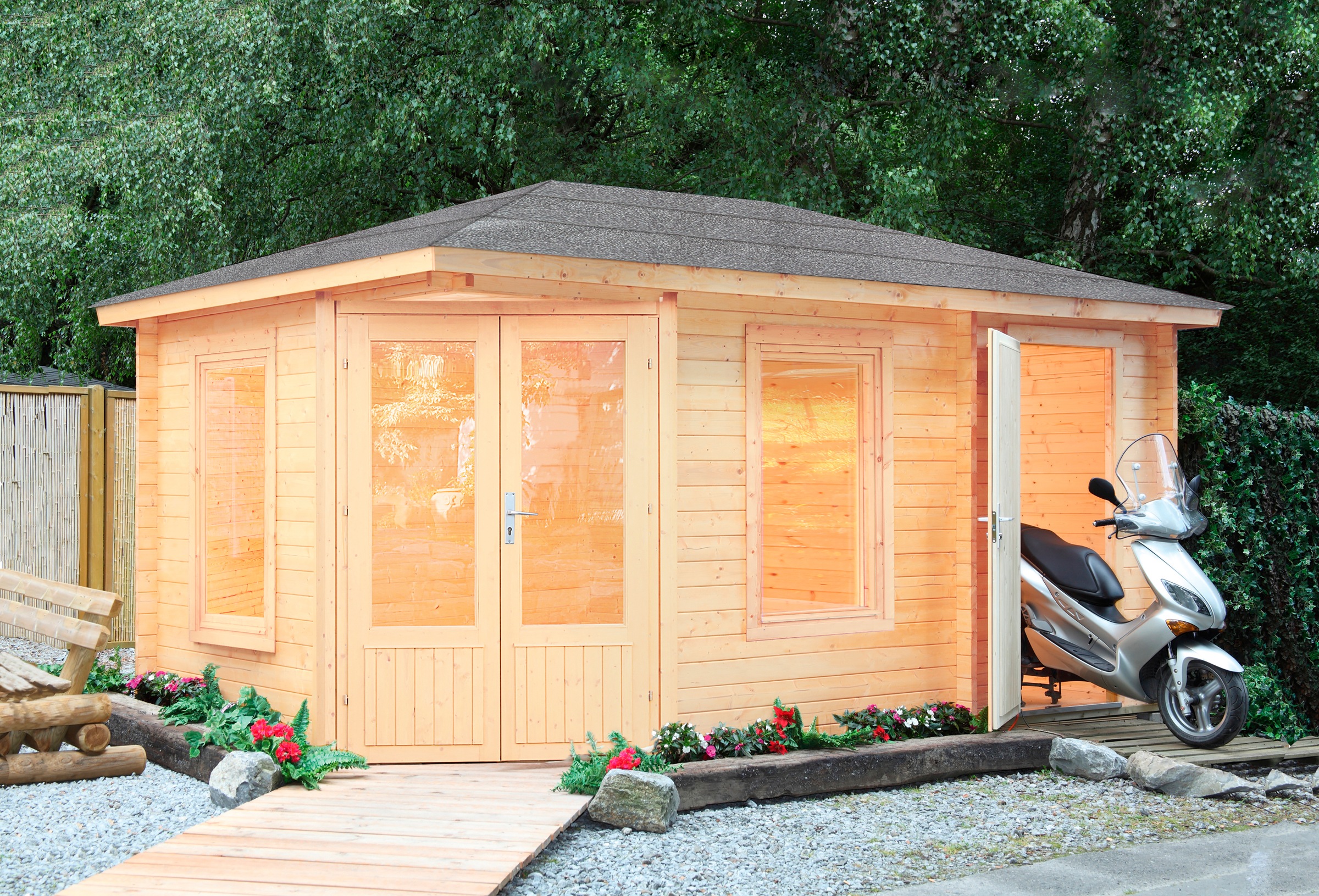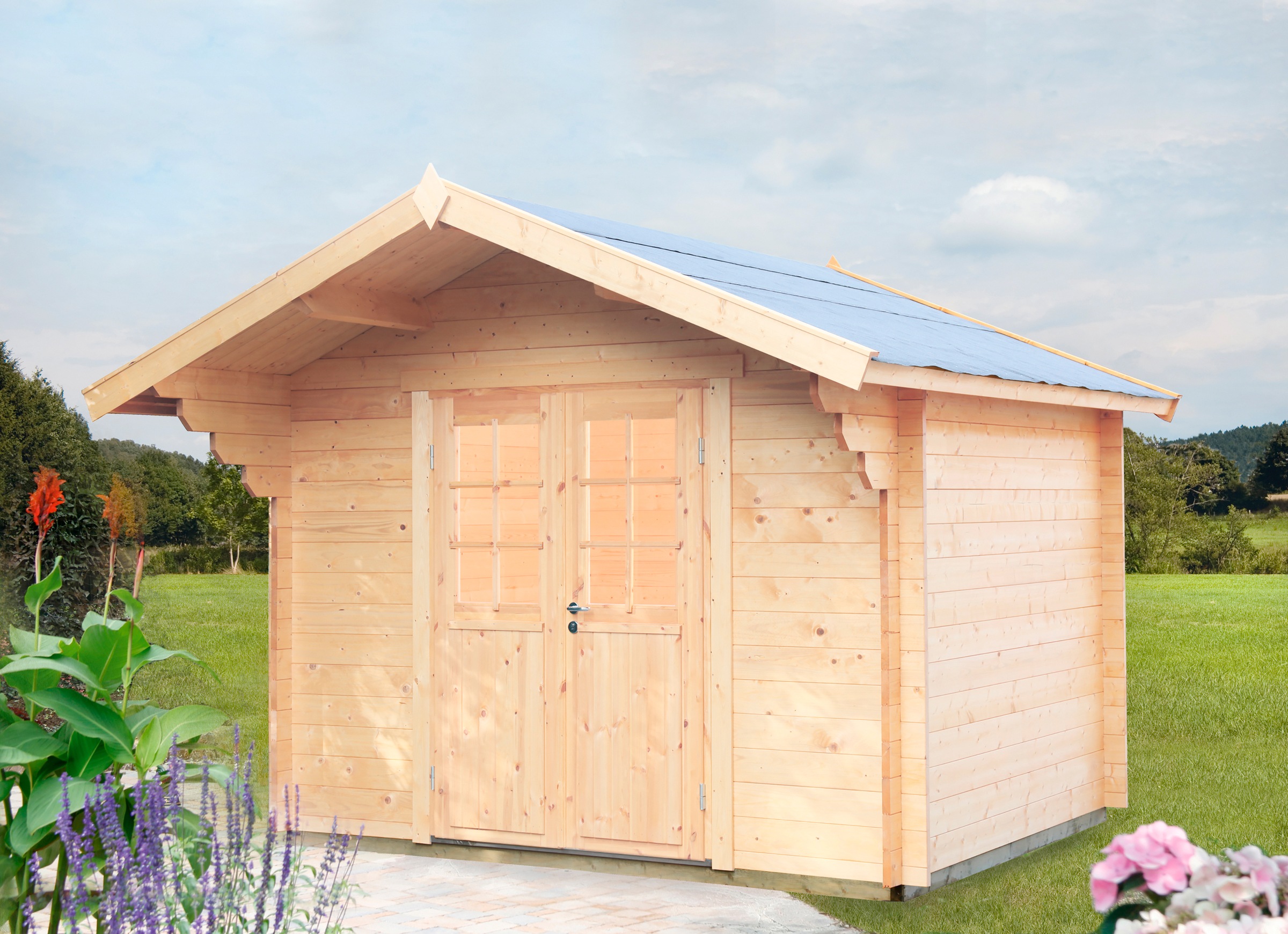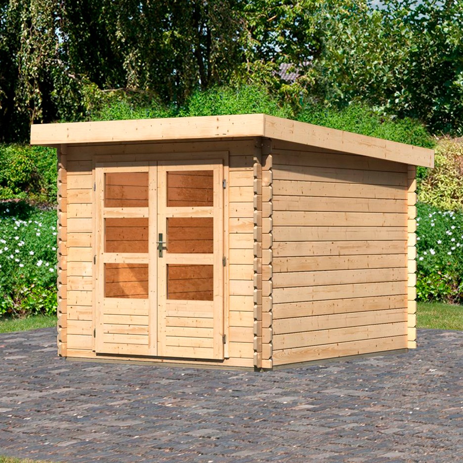 272 x 272 cm, inkl. Lasita gartenhaus flora 600 28 mm natur, mit 295 cm anbaudach das 28 mm starke blockbohlenhaus mit einer breiten doppelflügeltür mit lichtausschnitten aus echtglas verkörpert ein individuelles design in ihrem b x t x h: 475 x 298 cm, flachdach, inkl. Gartenhaus in stabiler blockbohlenbauweise, 28 mm wandstärke, mit 19 mm massivholzdach und massivholzboden, dachüberstände: